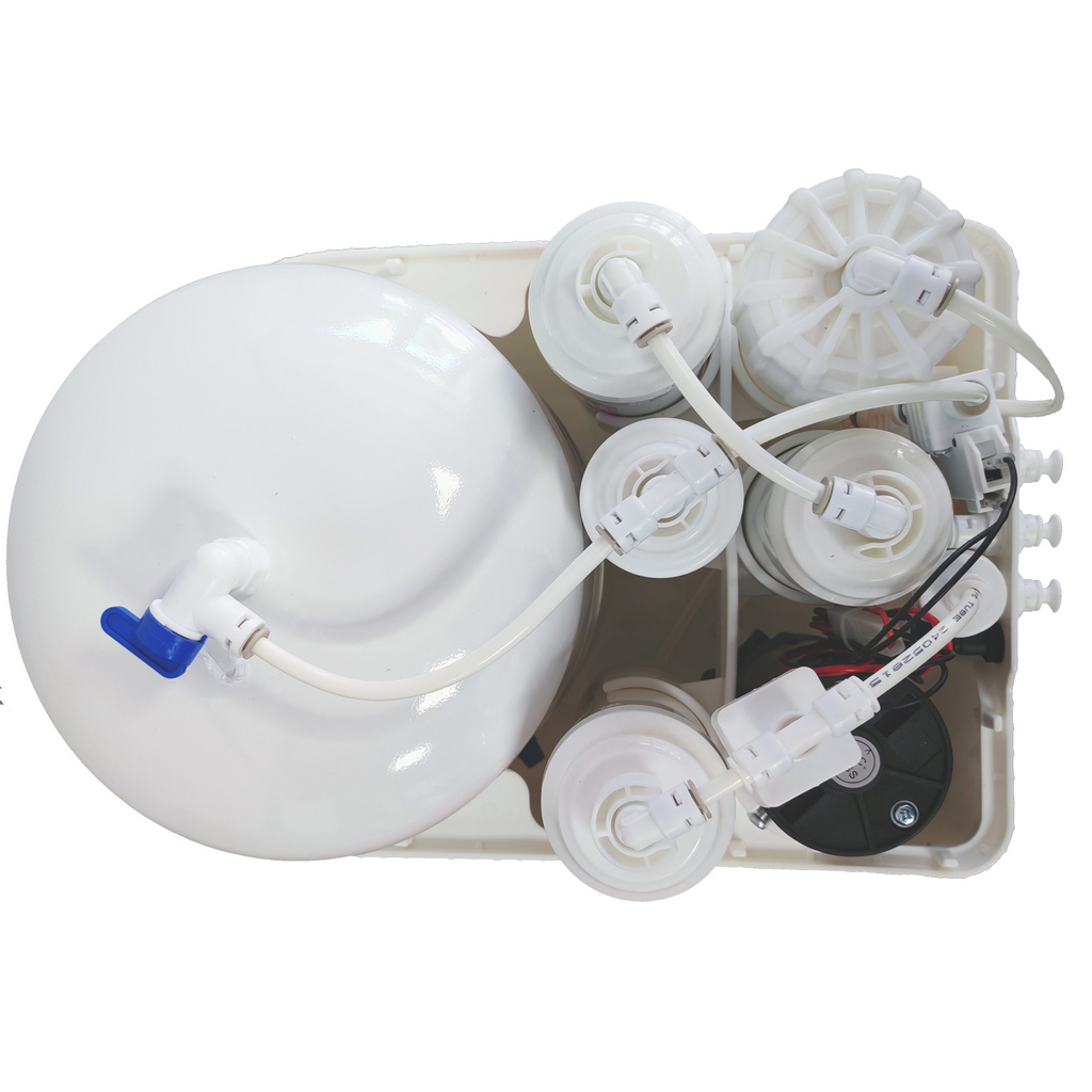 5 этап - Картридж пропускает воду через высококлассный активированный кокосовый уголь, благодаря чему вода приобретает приятный привкус и запах. Укомплектован помпой, которая обеспечивает работу фильтра при низком давлении. Также в комплекте редуктор давления — 60 PSI.